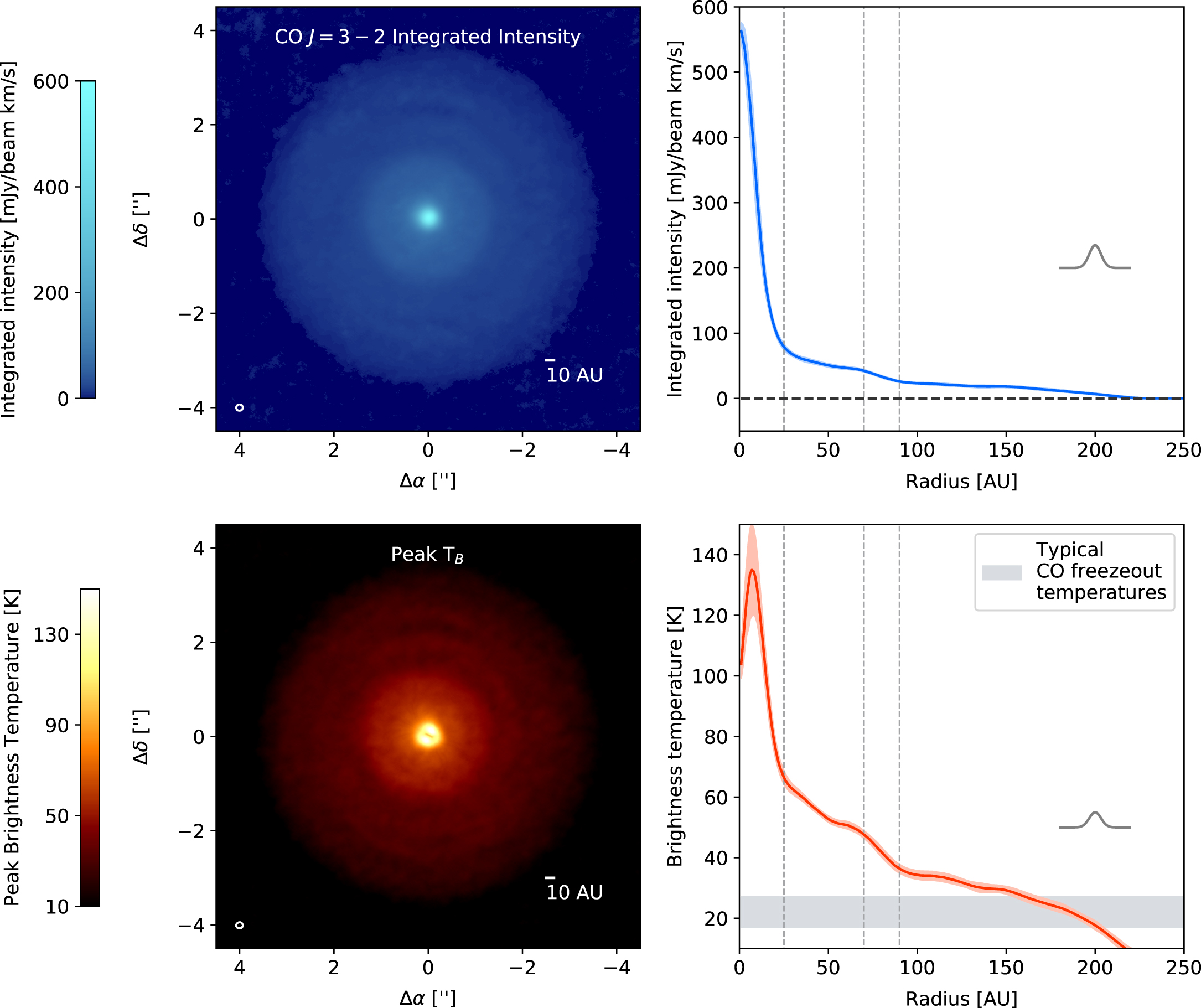 Figure 4. Top left: integrated intensity map of the 12CO J = 3 − 2 line. The synthesized beam is shown in the lower left corner. Top right: deprojected and azimuthally averaged radial profile of the 12CO J = 3 − 2 integrated intensity. The light-blue ribbon shows the 1σ scatter in each radial bin. The Gaussian profile shows the FWHM of the synthesized beam. Bottom left: peak brightness temperature map of 12CO J = 3 − 2. Bottom right: deprojected and azimuthally averaged radial profile of the 12CO J = 3 − 2 peak brightness temperature map. The light-orange ribbon shows the 1σ scatter in each radial bin. Vertical gray dashed lines mark the radial break in emission at 25 au, the shoulder at 70 au, and the second break at 90 au. Temperatures between 17 and 27 K are shaded gray to show CO freezeout temperatures that have been estimated for TW Hya (e.g., Qi et al. 2013 and Zhang et al. 2017).