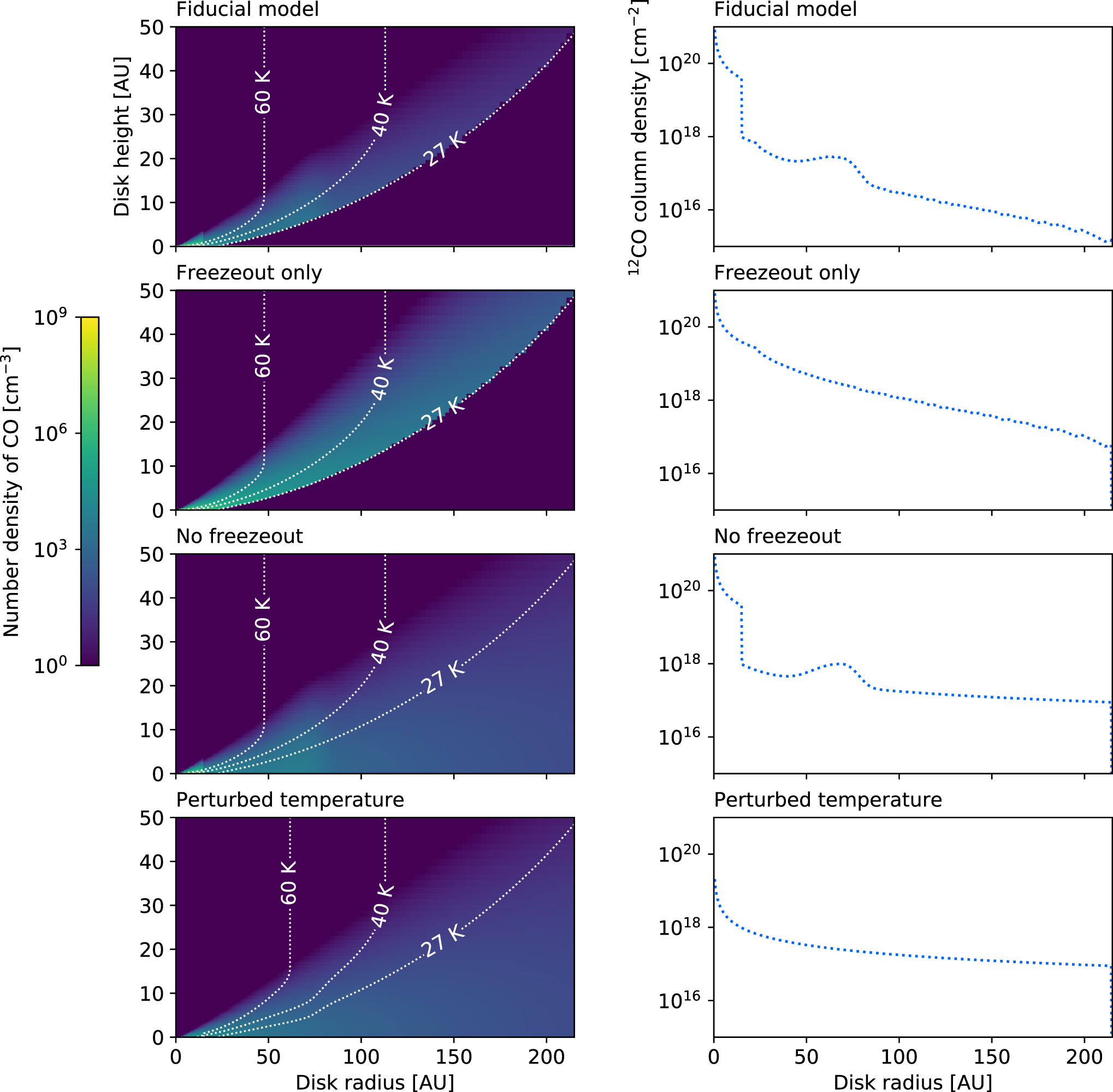 - 2.Analysis of the 12CO brightness temperatures and radiative transfer modeling suggest that the inferred CO column density variations are likely not associated with the onset of freezeout in the midplane. We propose instead that the variations in the 12CO column density arise either from spatial variations in XCO or from gas density reductions in the warm molecular layer of the disk. Based on similar features observed in the much lower abundance isotopologues, we further argue that these variations are likely present throughout most of the vertical extent of the warm layer. Distinguishing between CO depletion and gas disk substructures would be facilitated by obtaining more stringent constraints on the temperature structure of the disk and observing complementary molecular tracers of carbon depletion.