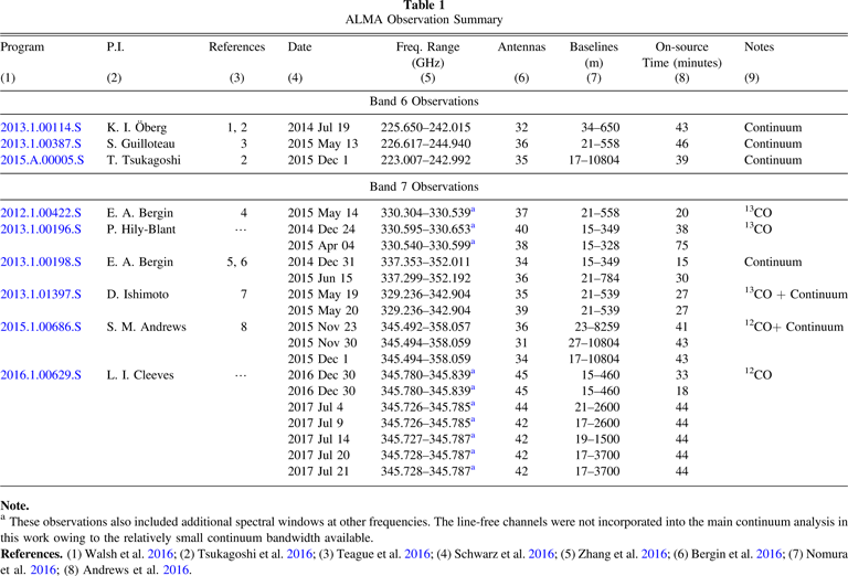 aThese observations also included additional spectral windows at other frequencies. The line-free channels were not incorporated into the main continuum analysis in this work owing to the relatively small continuum bandwidth available.References. (1) Walsh et al. 2016; (2) Tsukagoshi et al. 2016; (3) Teague et al. 2016; (4) Schwarz et al. 2016; (5) Zhang et al. 2016; (6) Bergin et al. 2016; (7) Nomura et al. 2016; (8) Andrews et al. 2016.