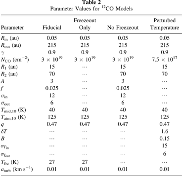 As shown in Figures 6 and 7, the emission morphology within a radius of 150 au is quite similar to the observations. As expected for optically thick CO, the relative variations in the thermal profile necessary to create emission substructure are much smaller than the variations that would be required in the column density profile. Whereas the key observed emission features were reproduced in the fiducial model through a factor of 40 decrease in the CO column density at 15 au and then a secondary bump by a factor of a few in the outer disk, the "perturbed temperature" model only boosts temperatures by 60% (δT = 1.6) in the inner disk and by 15% (B = 0.15) at the peak of the secondary ring relative to the fiducial model. The width of g2(r), setting the secondary bump in the temperature profile, is somewhat wider than that of f2(r), which sets the secondary bump in the CO column density profile in the fiducial model. Since the temperature profile declines more steeply with radius than the CO column density profile, the temperature has to be increased over a wider region to reproduce the same emission bump that is generated by an increase in the CO column density.