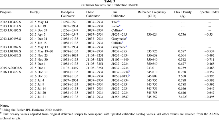 aUsing the Butler-JPL-Horizons 2012 models. bFlux density values adjusted from original delivered scripts to correspond with updated calibrator catalog values. All other values are retained from the ALMA archival scripts.Download table as: ASCIITypeset image