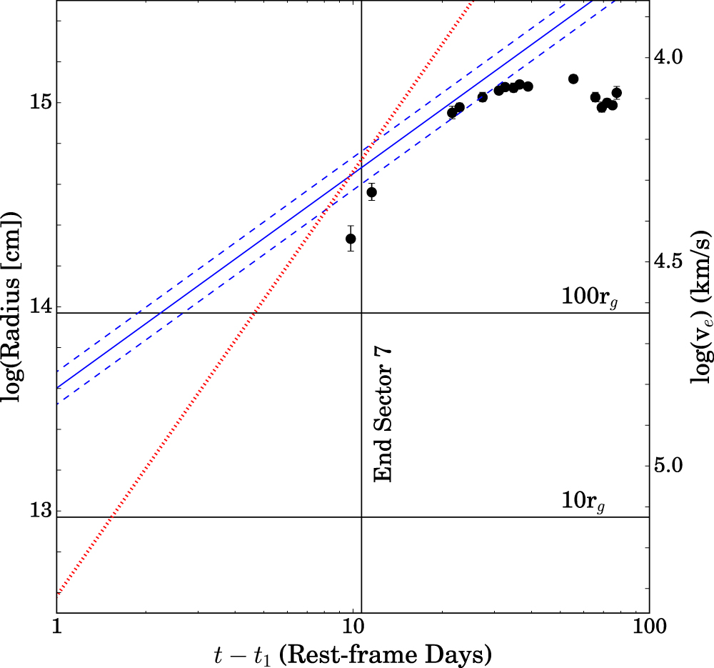 Figure 12. Radius evolution in rest-frame days from the estimated start of the TESS emission. The points show the results from the SED fits. The solid blue line bracketed by blue dashed lines shows the radius estimate from the TESS light curve assuming the temperature of the first Swift epoch, while the dotted red line shows the radius estimate assuming a power-law decline in temperature based on the first two Swift epochs. The dashed lines illustrate the scale of the uncertainties from the h parameter of the TESS light curve fits. The scale on the right is the escape velocity assuming a BH mass of 106.8M⊙. A vertical line marks the end of TESS Sector 7, and horizontal lines show the radii corresponding to 10 and 100 gravitational radii given our BH mass estimate.