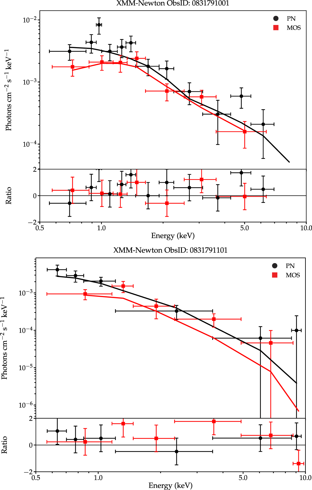 Figure 13. XMM-Newton PN (black) and merged MOS1+MOS2 (red) spectra of ASASSN-19bt taken ∼4 days before peak (top panel) and ∼42 days after peak (bottom panel). Each spectrum is binned to have 10 counts per energy bin. (a) The emission from ASASSN-19bt before peak is well fit by an absorbed power law with a photon index of Γ = 1.48 ± 0.3, while after peak, the emission is well fit with an absorbed power law with a photon index of Γ =