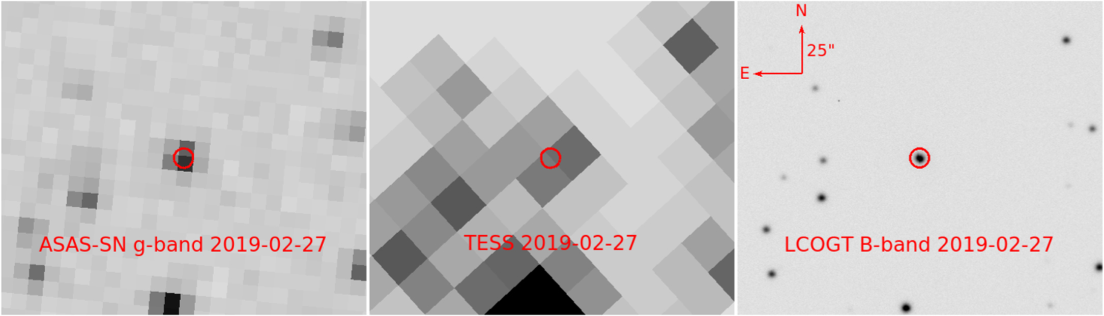 Figure 1. Images of ASASSN-19bt near peak light obtained with ASAS-SN (left panel), TESS (center panel), and a Las Cumbres Observatory 1 m telescope (right panel). The red circle has a radius of 5
