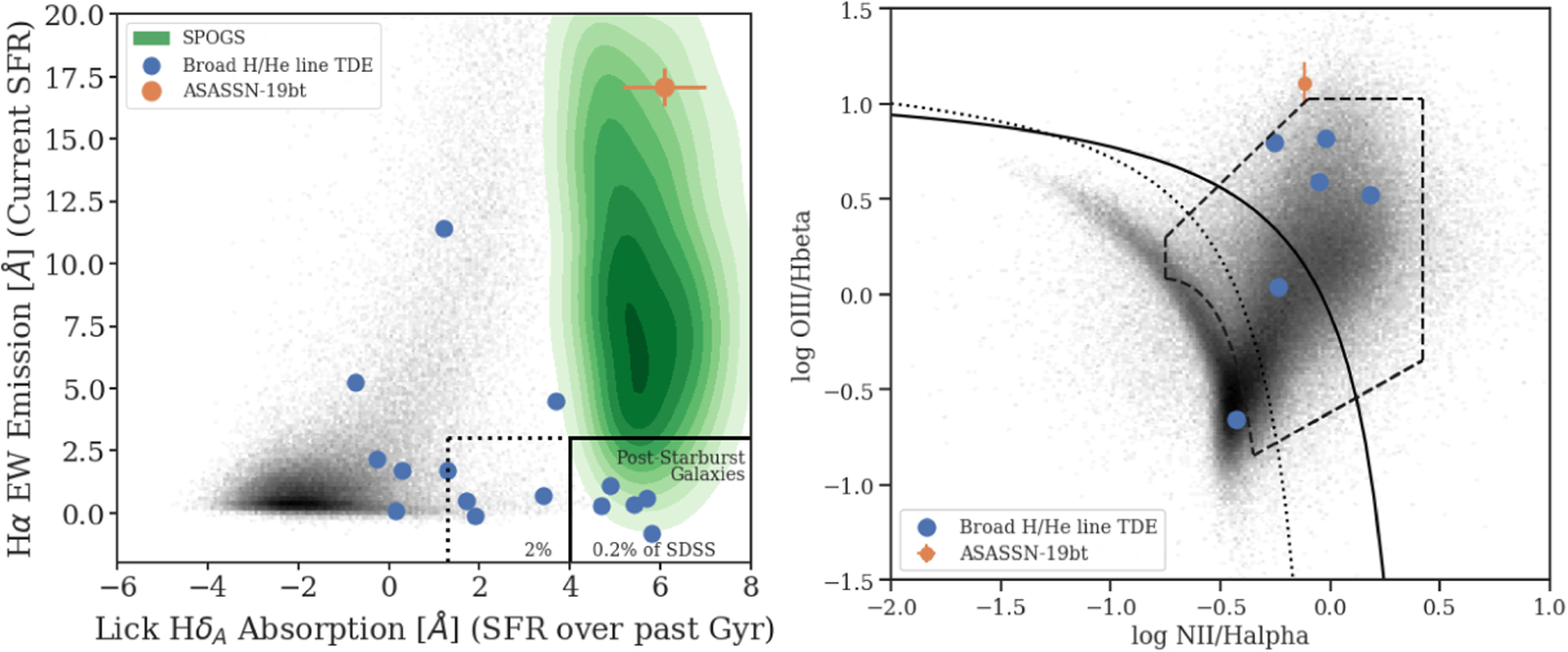 Figure 2. Left panel: lick HδA absorption (tracing star formation over the last Gyr) compared to the Hα EW emission (usually tracing current star formation) for 2MASX J07001137−6602251 in orange and several other TDE hosts in blue. Galaxies from the SDSS main spectroscopic survey (Strauss et al. 2002) are shown in gray. The green contours show the population of shocked post-starburst (SPOG) galaxies (Alatalo et al. 2016). 2MASX J07001137−6602251 has strong Hα emission like many star-forming galaxies, but its strong Balmer absorption places it closer to the population of SPOGs. Right panel: BPT diagram showing 2MASX J07001137−6602251 (orange) and other TDE host galaxies (blue). Galaxies from the SDSS main spectroscopic survey (Strauss et al. 2002) are shown in gray. The solid line is the theoretical maximum starburst line from Kewley et al. (2001), and the dotted line is the observed starburst−AGN separation from Kauffmann et al. (2003). The region enclosed by the dashed lines indicates galaxies with line ratios consistent with shocks. 2MASX J07001137−6602251 is in the Seyfert or non-star-forming portion of this diagram but slightly outside of the shocked region, so it is similar to, but not a part of, the SPOG population.