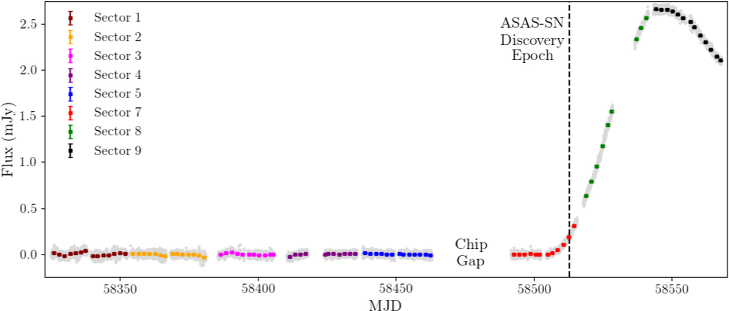 Figure 4. The TESS image subtraction light curve of ASASSN-19bt obtained for all currently available TESS sectors. ASASSN-19bt was not observed in TESS Sector 6 as the transient coordinates fell on a TESS chip gap. The extended gap in Sector 8 observations is due to an instrument anomaly on the spacecraft. Flux values for every epoch are shown in light gray, and the colored points show the mean values of 2 day bins. Error bars are shown for all of the colored points but are considerably smaller than the symbols.