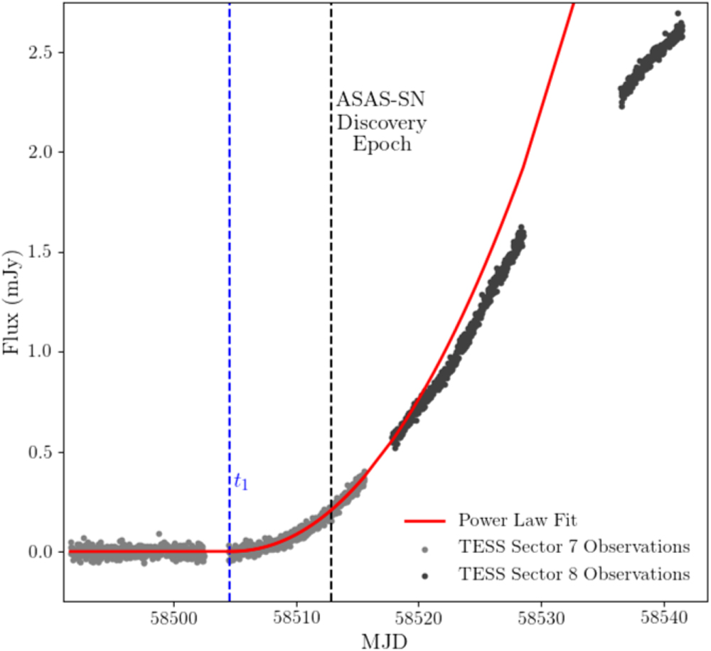 Figure 6. The TESS image subtraction light curve of ASASSN-19bt obtained during Sector 7 and Sector 8. Individual flux measurements obtained for each FFI are shown in gray, with different shades denoting each sector, and a best-fit power-law model to the Sector 7 data is shown in red. This power-law fit yields a time of first light of t1 = 58504.61 ± 0.42 and has an index of α = 2.10 ± 0.12. The blue dashed line and black dashed line show the inferred t1 and the ASAS-SN discovery date, respectively. The light curve begins to diverge from the initial power-law evolution roughly 15 days after first light.