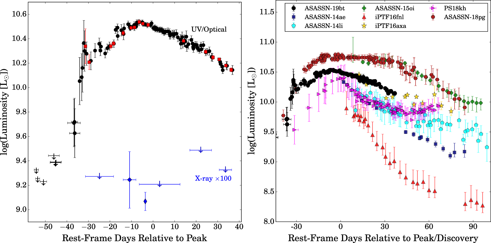 Figure 8. Left panel: evolution of the luminosity of ASASSN-19bt from blackbody fits to the UV/optical Swift sED (red squares) and estimated from the ASAS-SN g-band data by applying bolometric corrections based on the Swift fits (black circles). Swift XRT and XMM-Newton X-ray luminosities are shown as wide and thin blue diamonds, respectively, multiplied by a factor of 100 to improve readability. X-axis error bars indicate data ranges for data combined to obtain a single measurement, and downward arrows indicate upper limits. Right panel: comparison of the luminosity evolution of ASASSN-19bt (black circles) to that of the TDEs ASASSN-14ae (navy squares; Holoien et al. 2014), ASASSN-14li (cyan penatgons; Holoien et al. 2016b), ASASSN-15oi (green diamonds; Holoien et al. 2016a), iPTF16fnl (red triangles; Brown et al. 2018), iPTF16axa (gold stars; Hung et al. 2017), PS18kh (magenta right-facing triangles; Holoien et al. 2018), and ASASSN-18pg (brown hexagons; T. W.-S. Holoien et al. 2019, in preparation). Time is shown in rest-frame days relative to peak for those objects that have observations spanning the peak of the light curve (ASASSN-19bt, ASASSN-18pg, and PS18kh) and in days relative to discovery for those objects that do not (ASASSN-14ae, ASASSN-14li, ASASSN-15oi, and iPTF16fnl).