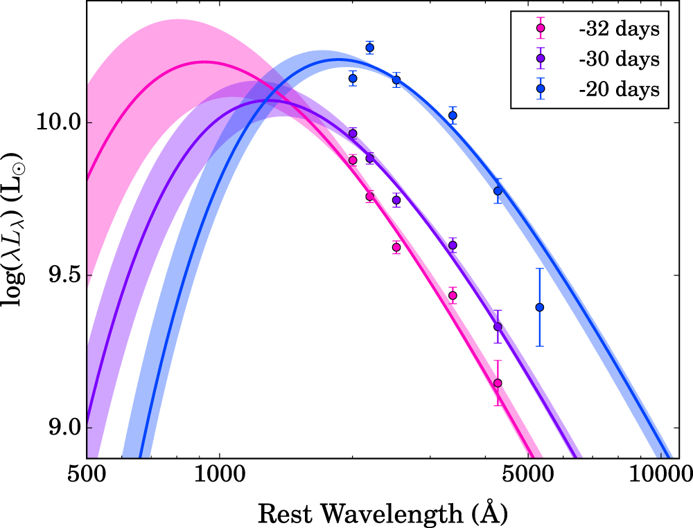 Figure 9. The first three Swift epochs and their blackbody fits. The solid lines show the SEDs of the median luminosity fits to each epoch, and the shaded regions show the range of SEDs for the 16%–84% confidence interval on the luminosity. The phase in rest-frame days relative to peak is given in the legend.