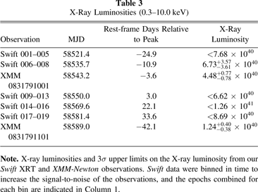Figure 8 also shows the X-ray luminosities calculated from the Swift XRT and XMM-Newton observations, scaled up by a factor of 100 to make them comparable to the UV/Optical luminosities. We do not detect X-ray emission in most epochs, and all detected luminosities are three or more orders of magnitude weaker than the UV/optical emission. We also see some evidence that X-rays are only detected near the peak of the UV/optical light curve. We further analyze and discuss the X-ray results in Section 3.4 below.