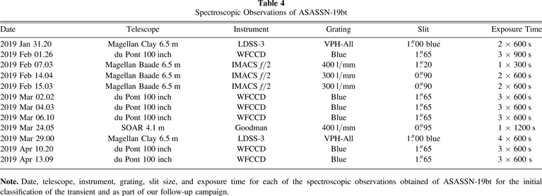 Note. Date, telescope, instrument, grating, slit size, and exposure time for each of the spectroscopic observations obtained of ASASSN-19bt for the initial classification of the transient and as part of our follow-up campaign.