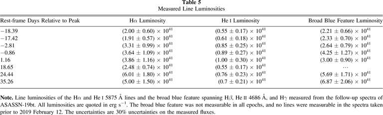 Note. Line luminosities of the Hα and He i 5875 Å lines and the broad blue feature spanning Hβ, He ii 4686 Å, and Hγ measured from the follow-up spectra of ASASSN-19bt. All luminosities are quoted in erg s−1. The broad blue feature was not measurable in all epochs, and no lines were measurable in the spectra taken prior to 2019 February 12. The uncertainties are 30% uncertainties on the measured fluxes.
