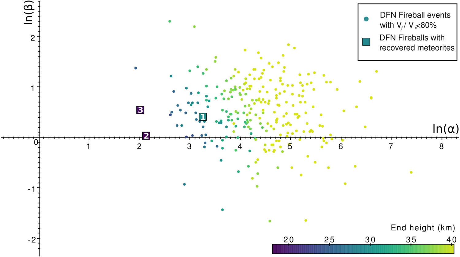 as the x-axis, this effect is removed (Figure 3). The clear horizontal trend in end heights, discussed in the previous section, now falls apart; there is no longer a distinct relationship. This is where the modified α–β diagram in Figure 3 is a more inclusive classification tool for fireballs. We no longer need to rely on final velocity and final end height requirements to classify a meteorite-dropping event.