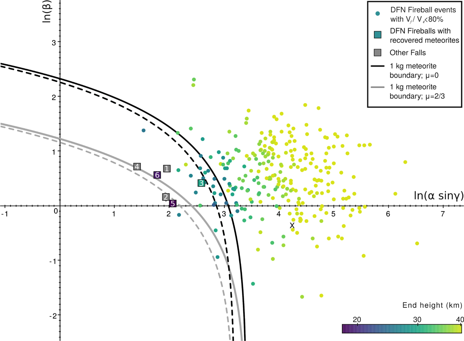 Let us return to the gray DFN events in Figure 4 that are within the "likely fall" region (we include the two on the μ = 2/3 line). Of the five, the most eye catching is at [2.88, −0.936] in Figure 4 and from video data shows significant flaring, including a final late flare. The mass at this point is still significant (1 kg) and a search for fragments will be conducted in the future. The event at [2.30, 0.75] in Figure 4 is a great example of hardware limitations interfering with expected results. DFN observatories are designed to take a 25 s long-exposure image every 30 s. This 5 s down time allows images to be saved and systems to be reset. This event likely continued to ablate beyond the end of the exposure and was unfortunately not captured in the subsequent image. The remaining three are triangulated from observatories at significant ranges; the closest camera to DN151105_15 (Figure 4 [3.08,0.27]) was 430 km. These are therefore still possible fall candidates that were missed by the empirical criteria, simply because the end of bright flight was not observed. These were modeled using Sansom et al. (2015) and masses at this last observed point are all >100 g. This method is therefore able to identify likely fall events that might previously have been missed if using the empirical criteria for a typical meteorite-dropping event.