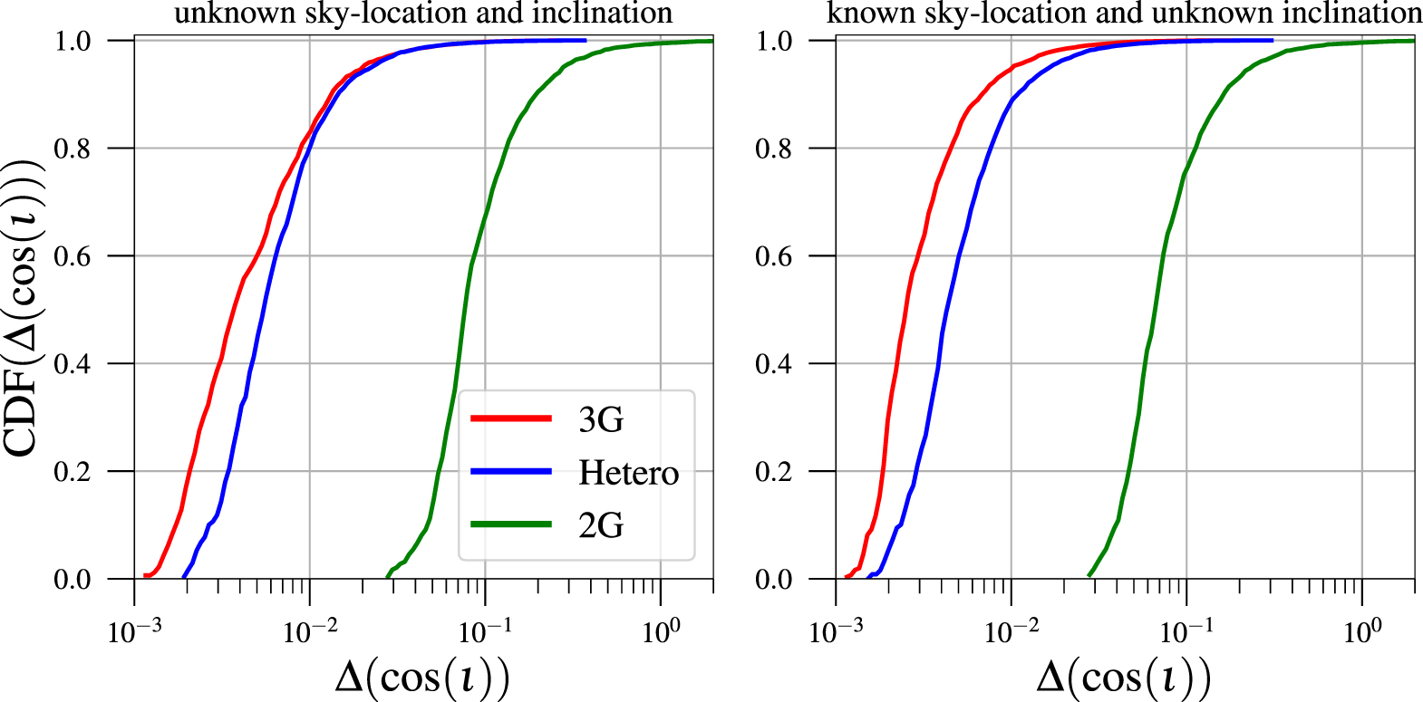 Standard image High-resolution imageFigure 4. Cumulative distribution of 1 − σ inclination error measured with various networks of detectors, 2G, 3G, Hetero, summarized in Table 1. A population of binary neutron stars with fixed masses m1 = 1.45 M⊙ and m2 = 1.35 M⊙ have isotropic sky locations and orbital inclinations and are uniformly distributed in the co-moving volume between 10 and 300 Mpc. The left panel shows the errors when the sky location and orbital inclination of the binaries are not known. The right panel shows the error when the sky location of the binaries is known. All the sources plotted here have network S/N ≥ 10.