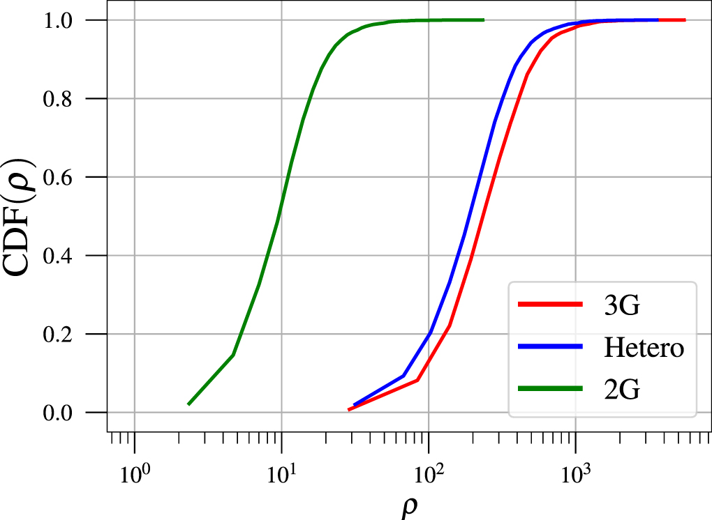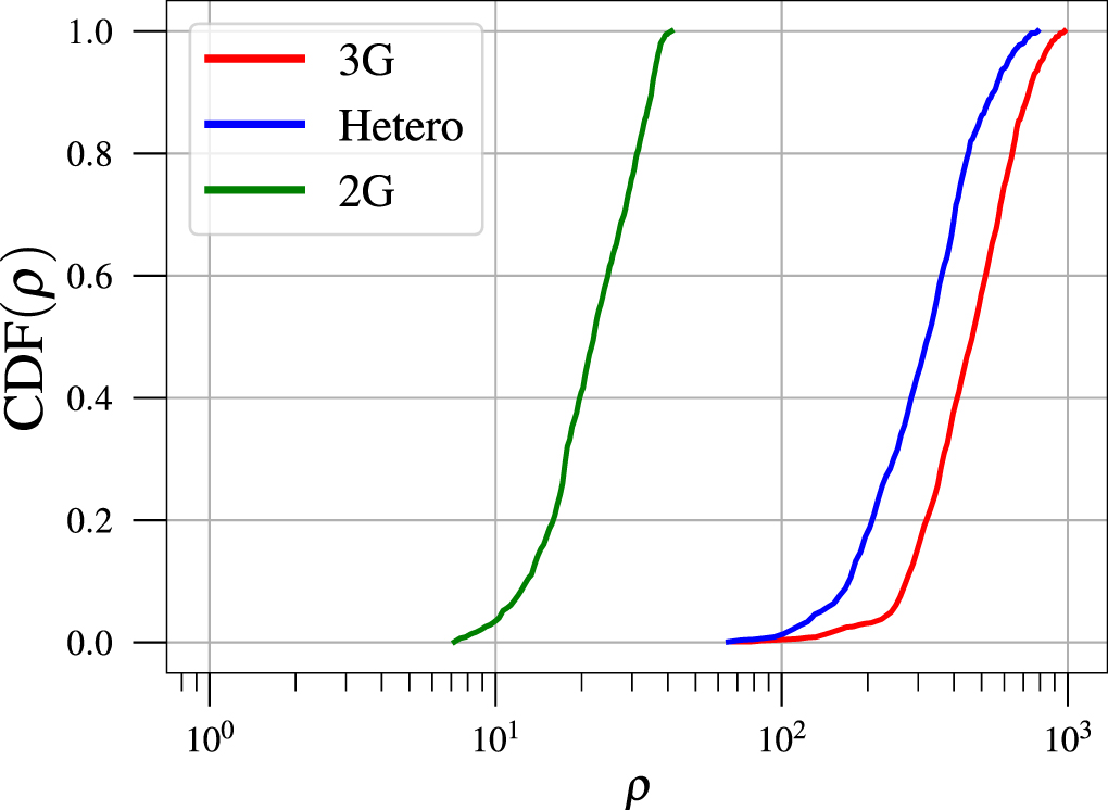 Figure 2. Cumulative distribution of network S/N for 2G, 3G, and Hetero networks, summarized in Table 1. A population of binary neutron stars with fixed masses