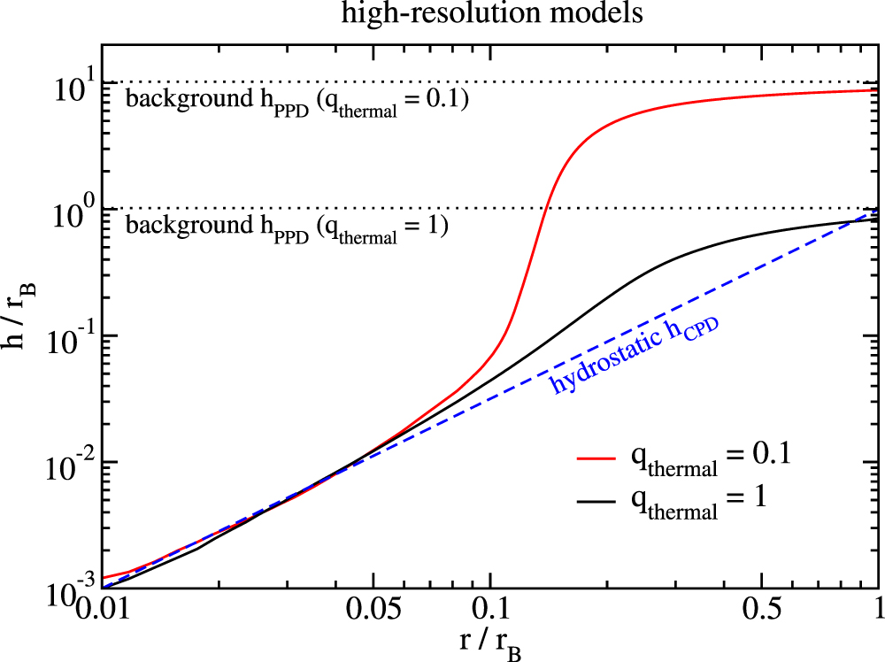 (Figure 4). This leaves much room for speculation. An isothermal CPD could potentially become more massive if there are angular momentum transport mechanisms that allow it to accrete. Zhu et al. (2016), for example, reported shock-driven and vortex-driven accretion in their 2D simulations. Reality might be a mixture of the 1D and 3D models. The outer parts of the atmosphere (still within