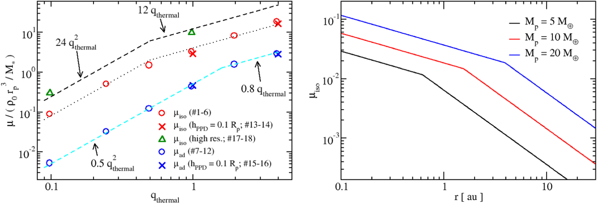 core surrounded by fully cooled, isothermal gas (right panel of Figure 16). Theoretically, the adiabatic and isothermal cases should bracket a planet's thermal (i.e., accretion) history—the atmosphere/CPD starts off behaving adiabatically on timescales shorter than the cooling time, and becomes isothermal on timescales longer than the cooling time (e.g., Lee et al. 2014; Lee & Chiang 2015; Ginzburg et al. 2016; Coleman et al. 2017). It is expected that μ will evolve from the adiabatic to the isothermal state monotonically.6