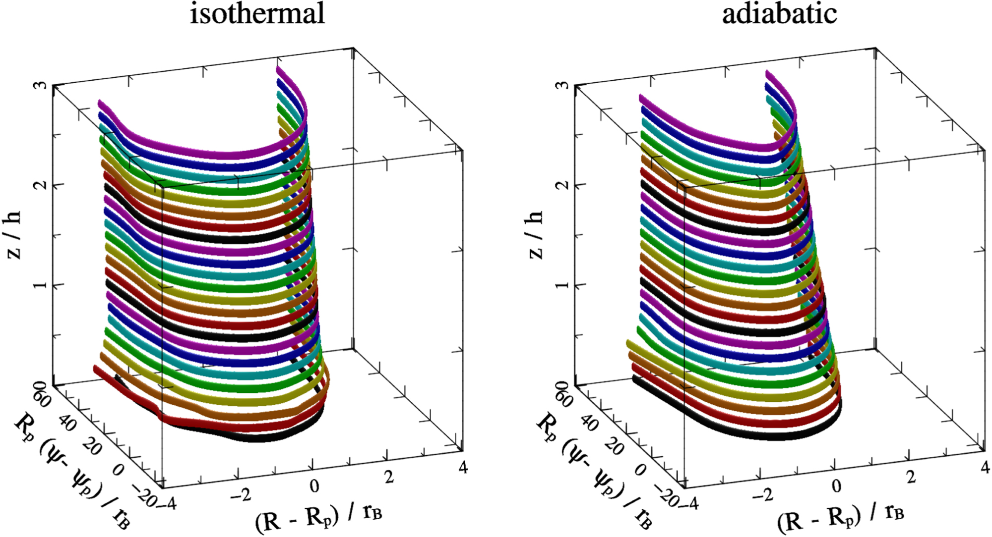. On the left, we confirm that isothermal flow produces a columnar structure. On the right, we find that adiabtic flow is similarly columnar, but the width of horseshoe region gradually shrinks with height. At three scale heights, it shrinks to about half its width in the midplane.