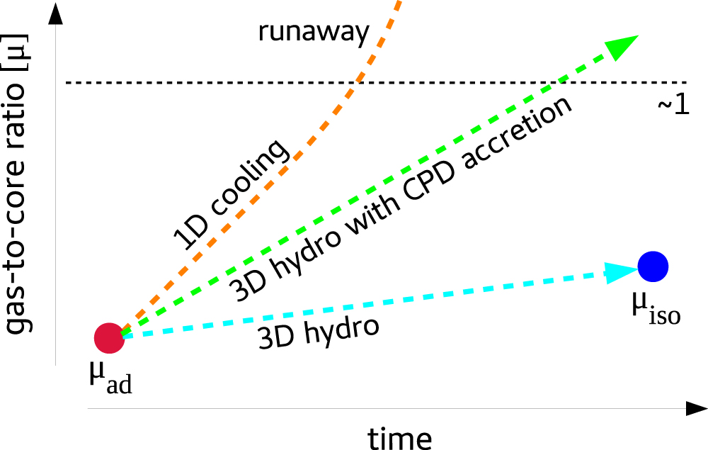 We illustrate these ideas in Figure 22 by drawing some schematic evolutionary paths. One-dimensional models predict a cooling phase followed by a runaway phase after μ reaches unity (orange path). Our 3D simulations, taken at face value, indicate that cooling alone leads to much smaller values of μ (cyan path). However, if one combines cooling, 3D hydrodynamics, and disk accretion physics, then one might produce an evolutionary path resembling the green path. Gas giants may form if disk accretion (and eventually, self-gravity) push μ above unity.