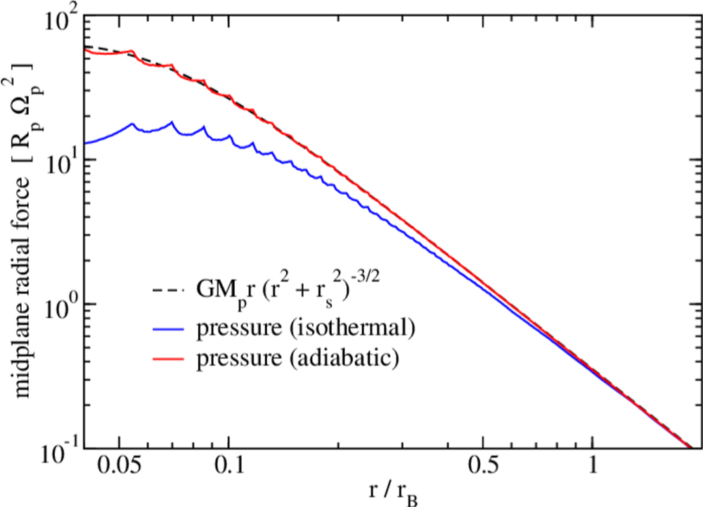 is included to prevent numerical instability very close to the planet, and could represent the size of the planet's solid core. For example, the radius of the Earth at 1 au is about 1.6% of the Earth's Bondi radius. In this work, we do not assume a size for the core, and instead aim to quantify how our results depend on