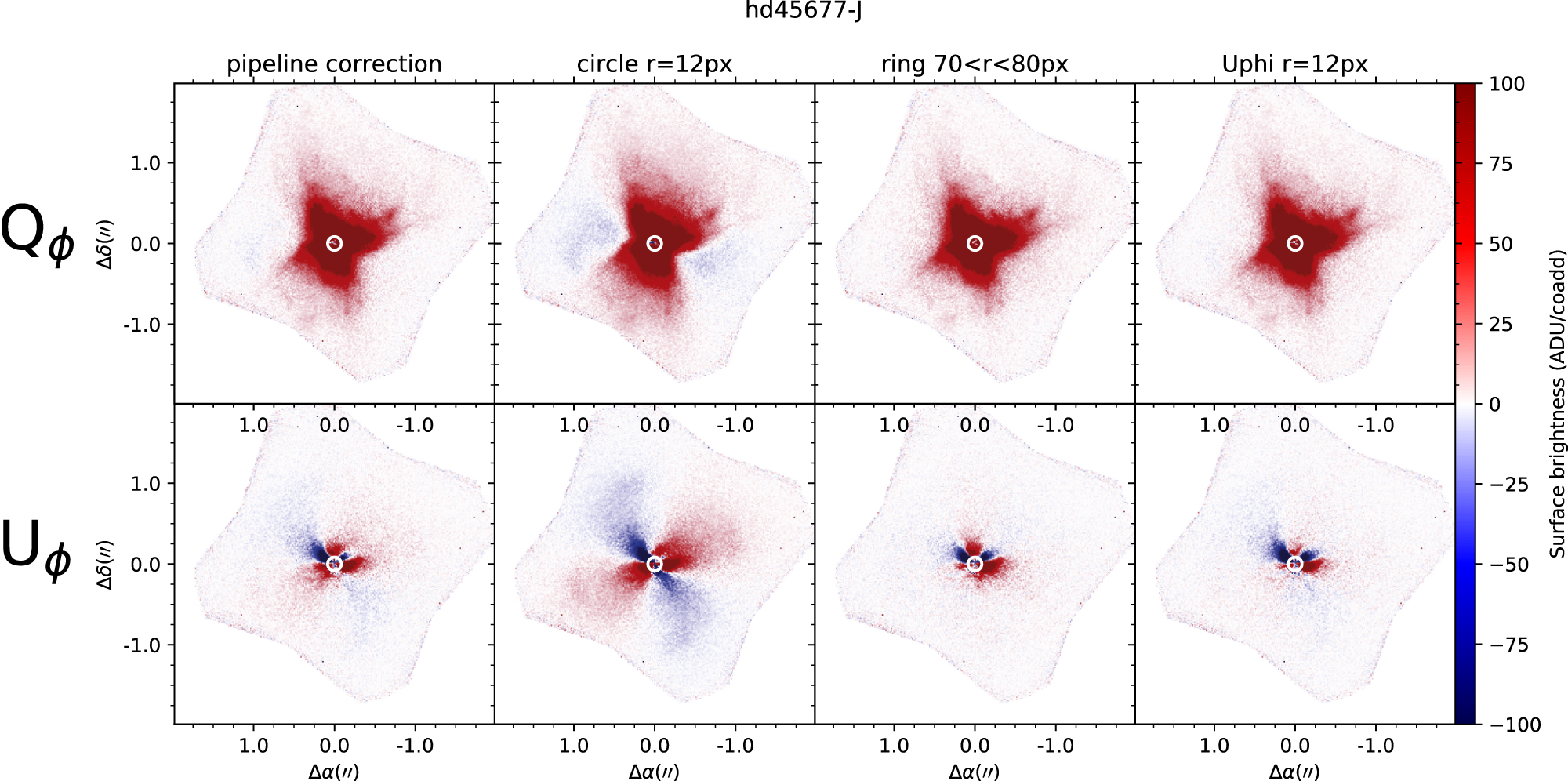 A comparison of the four methods for one object, HD 45677 in J, is shown in Figure 10. For most of the presented objects, the reduction made no difference to the appearance of Qϕ; however, for HD 45677 there is a strong negative signal introduced to the east and west when using the circle reduction method. Given that the reduction method can affect even structures in Qϕ, it is especially important to use the optimal method. The differences between methods are even more pronounced in Uϕ. The DRP and circle methods give the strong square background pattern, and this effect is visible to a much reduced extent using the Uϕ minimization. The effect is almost entirely removed with the ring method. We find that this holds for all of our presented objects—the ring method consistently removes the background square pattern much better than the other methods.