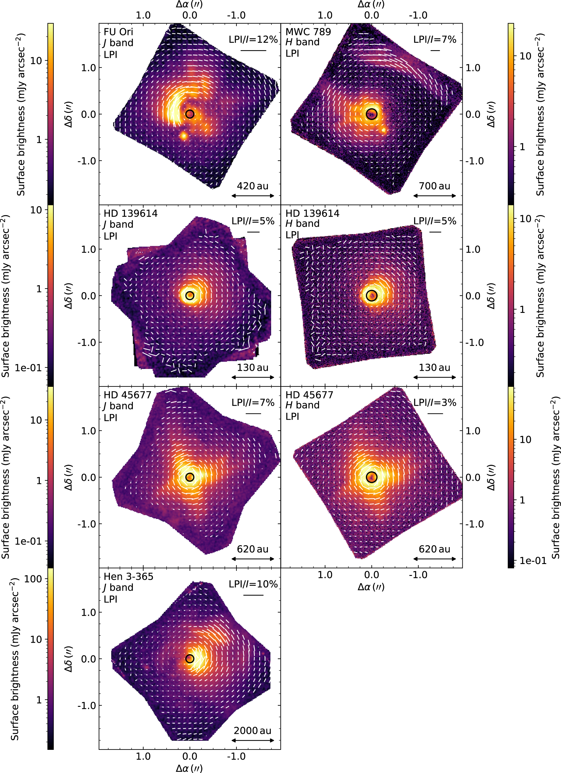 Figure 11 shows our objects in linearly polarized intensity with polarization vectors to show the position angle across the image. The figure is provided as an alternative to the Qϕ, Uϕ representation in Figures 3 and 4 respectively. Broadly speaking, the images show the same structures as Qϕ with the addition of any radially polarized regions that are negative in Qϕ and so are absent from Figure 3, for example the companion FU Ori S and the dark region to the east of the spot in Hen 3-365.