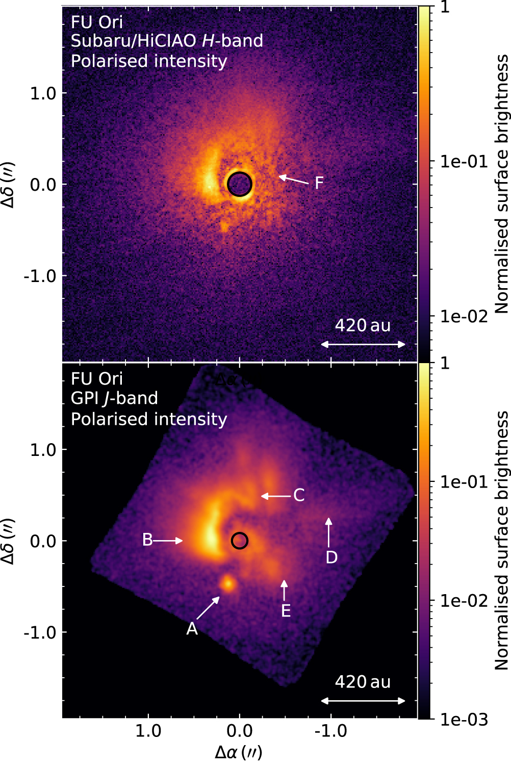 Figure 6. Linearly polarized intensity images of FU Ori. Top panel: the SUBARU/HiCIAO H-band image (Takami et al. 2018). Bottom panel: the GPI J-band image. The GPI image reveals the same structures at higher resolution. The following features are labeled: A, the bright stellar companion, FU Ori S; B, a bright asymmetrical arm that extends around 200 au toward the north and east directions; C, a dark stripe toward the northern tip of arm A; D, a faint tail of material; E, a diffuse region; and F, a feature identified in the HiCIAO image as a potential arm that does not appear in the GPI image. In both panels, the black circle marks the extent of the coronagraphic spot.