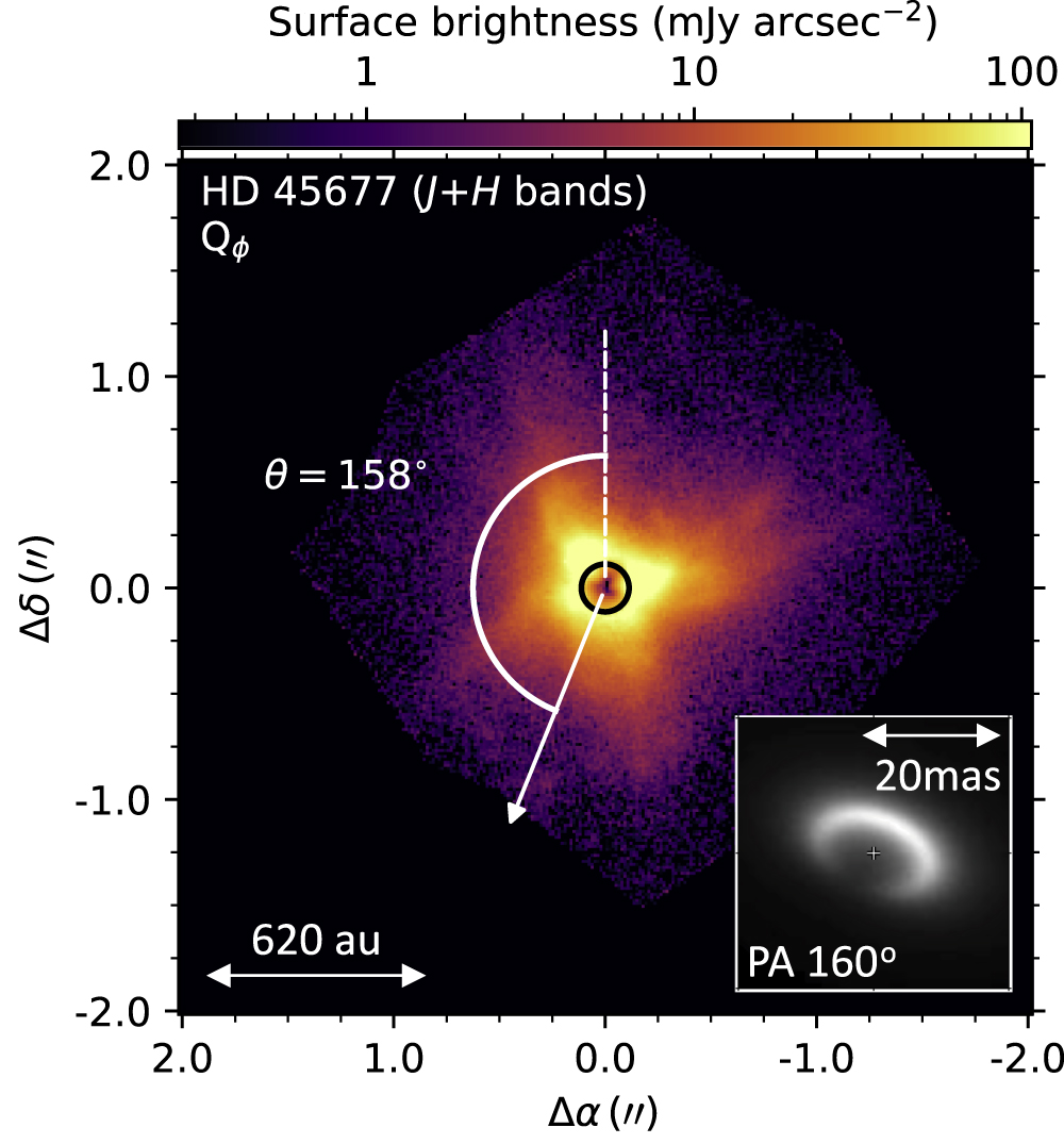 Figure 7. Radial Stokes Qϕ image of HD 45677. J- and H-band images are combined linearly to improve the signal-to-noise ratio. Annotations show the symmetry position angle θ = 158° of the observed bipolar nebula structure as calculated in Section 4.3. The inset image shows the model of the ring in the inner few milliarcseconds (Monnier et al. 2006), whose major axis shares a position angle with the larger-scale emission.