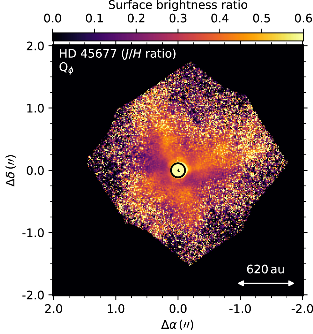 Figure 8. Radial Stokes Qϕ image of HD 45677 showing the J-band image divided by the H-band image. The two images were separately converted to mJy arcsec−2 before combination, but were not normalized with respect to each other before division.