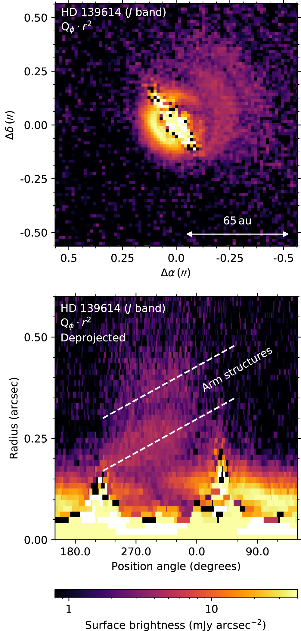 Standard image High-resolution imageHD 139614 shows faint emission in Qϕ out to ∼150 au in all directions around the object (particularly on the western side) and a brighter region within 50 au of the center, consistent with predictions that the outer disk extends to 75–100 au (Patel et al. 2006; Labadie et al. 2014). Depending on the positioning of the coronagraphic spot, the structure at 50 au could correspond either to a ring or a tight spiral arm. Our three independent observations show that this structure lies consistently to the north of the star, which strongly supports the tight spiral arm interpretation. The spiral arm originates from the north and continues counterclockwise around the image. Its inner edge is just visible in data taken without coronagraphy shown in Figure 9. It is impossible to flux-calibrate an image without coronagraphy using the DRP methods described in Section 3.2, so we use the flux scale from contemporary data taken with the coronagraph. Both stars in the HD 139614 binary system appear saturated in the image without the coronagraph and cause a distorted band near the center of the image. It is not possible to locate the two stars behind this distortion.