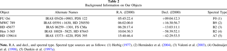 Note. R.A. and decl., and spectral type. Spectral type sources are as follows: (1) Herbig (1977), (2) Hernández et al. (2004), (3) Valenti et al. (2003), (4) Oudmaijer et al. (1998), (5) Dunkin et al. (1997a).