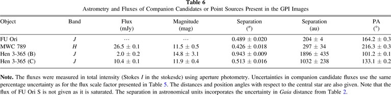 Hen 3-365 shows two faint point sources that we designate B and C. Their fluxes, separations, and position angles are given in Table 6. The source Hen 3-365-B is considerably fainter than Hen 3-365-C and the companion candidate star around MWC 789, at only ∼10%–20% of the latter objects' fluxes. The two point sources appear with negative Uϕ and are located away from the central stars, with distances on the order 1000 au. Because the point sources are so small and faint, it is unlikely that they have distorted the Qϕ, Uϕ images to create false evidence of multiple scattering. In particular, they are far away in physical and projected distance from the northwestern arc that shows structure in Uϕ and are unlikely to be responsible for this structure. Any association of the point sources and the central star should be investigated with follow-up observations to see if the point sources are comoving.