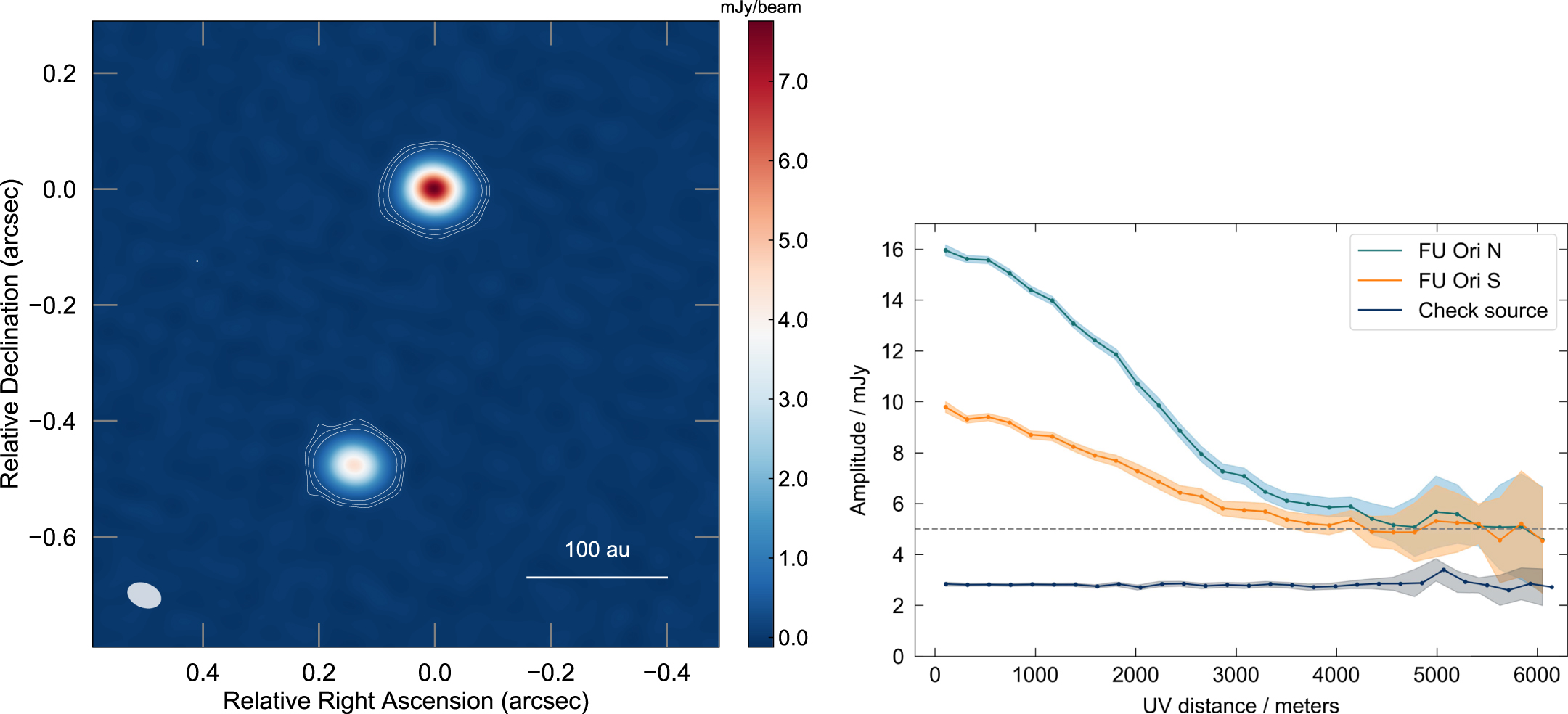 042 (shown in the left bottom corner). The contours are 3, 5, and 10 times the image rms noise of the 30 μJy beam−1. North is up, east is left. Right: visibility amplitude as a function of baseline lengths (ultraviolet distances) for FU Ori north (blue), FU Ori south (orange) and check source J0551+0829, with their respective uncertainties. The visibilities of both FU Ori components have a profile that decreases from the peak maximum to a 5 mJy floor level (dotted line). The signal for J0551+0829 is constant with baseline length, as expected for an unresolved source.