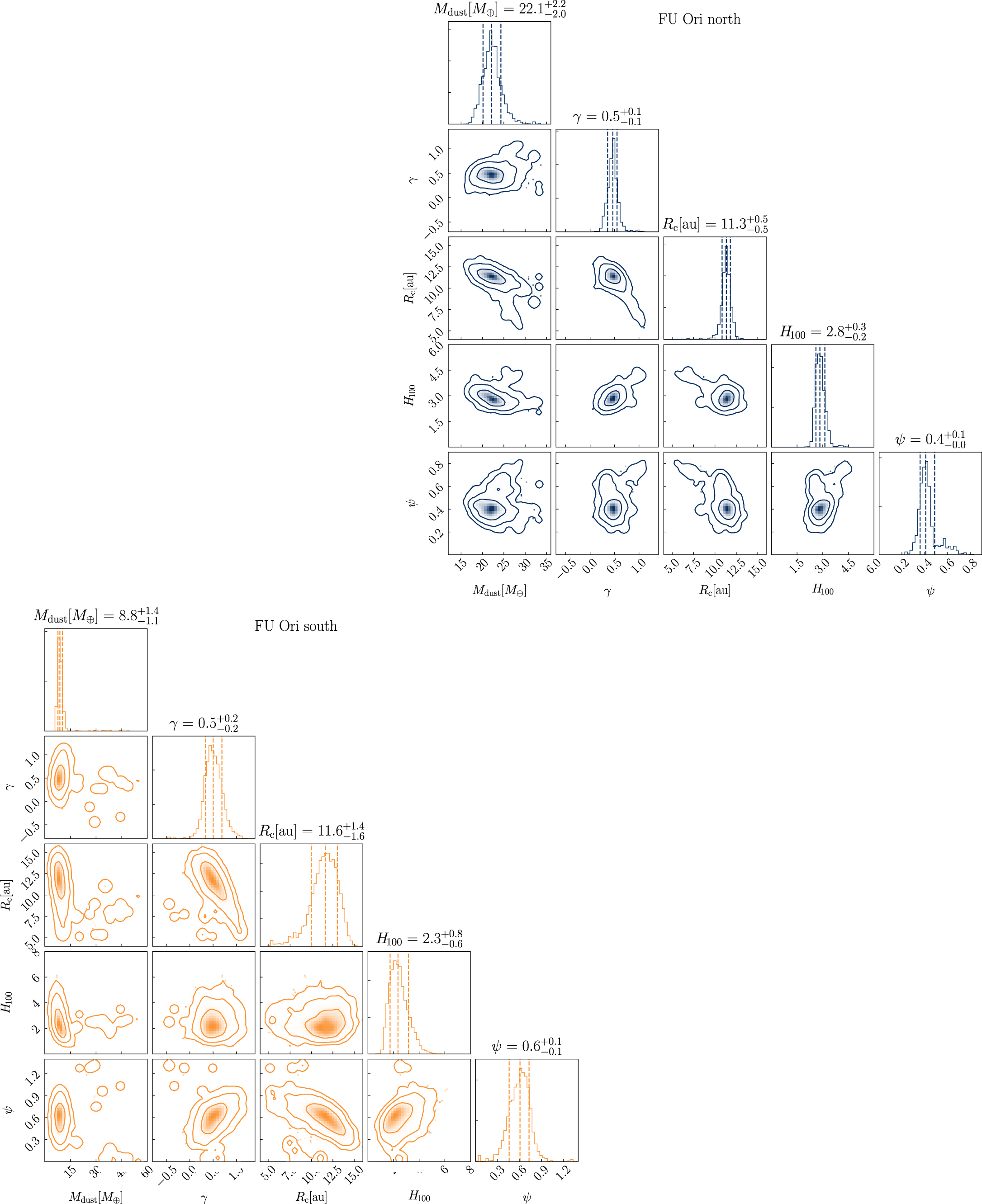 Figure 2. Posterior distributions of disk parameters Mdust, γ, Rc, H100, and the flaring index Ψ, including their marginalized distributions for FU Ori north (top right, blue) and south (bottom left, orange). The vertical dashed lines represent the 16th, 50th and 84th percentiles. Contours correspond to 68%, 95% and 99.7% confidence regions. Units are specified on the panel titles. The plots were generated using the python module corner (Foreman-Mackey 2016).