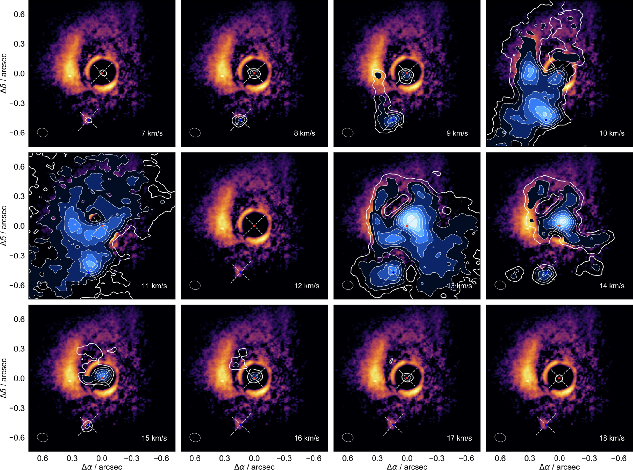Figure 3. Complex kinematic environment and evidence of disk rotation seen in the 12CO channel maps of the FU Ori system. The orientation (PA and inclination) inferred from the continuum maps are indicated by the white dashed lines for each disk. The northern component shows signatures of rotation as blue- and redshifted 12CO emission loci along the disk PA. The red and blue points show the stellar locations of FU Ori north and south, respectively. The velocities, in km s−1, are given in the lower right corners. Each panel shows 12CO emission via color-filled contour maps for 13, 17, 21, 25, 29, 33, 37, and 41 mJy beam−1. The thicker unfilled white contour shows the 5σ level, i.e., 10 mJy beam−1 (σ is 2 mJy beam−1). The beam size is shown as a gray ellipse in the lower left corner. The systemic velocity (∼11.7 km s−1) channel at 12 km s−1 suffers heavy foreground absorption and displays no emission above 5σ. Relative R.A. and decl. are shown with respect to the location of FU Ori north (peak of the continuum). The background image shows the High-Contrast Coronographic Imager for Adaptive Optics (HiCIAO) polarized scattered light map published in Takami et al. (2018), see also Liu et al. (2016).