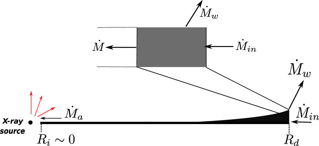 We assume azimuthal symmetry and perform 1D simulations on a geometrically thin and optically thick disk along the radial direction. We have adopted similar formulations and notations as used in S86. Their approach involves solving the diffusion equation that describes the disk evolution (Lynden-Bell & Pringle 1974; Pringle 1981). As in S86, we assume a constant rate of mass injection at the outermost disk radius, Rd, from an external source. This is true for all the cases studied henceforth. The loss of mass in the form of wind takes place at the very same radius as for the first model, which corresponds to the model described by Equation (3.5) in S86 (see Section III.(b) in S86). Figure 1 shows a schematic of this model. We also assume a simple radius-dependent viscosity ν ∝ R, similar to that used in Lynden-Bell & Pringle (1974), for all our models. The mass continuity and angular momentum conservation gives us the following diffusion equation,
