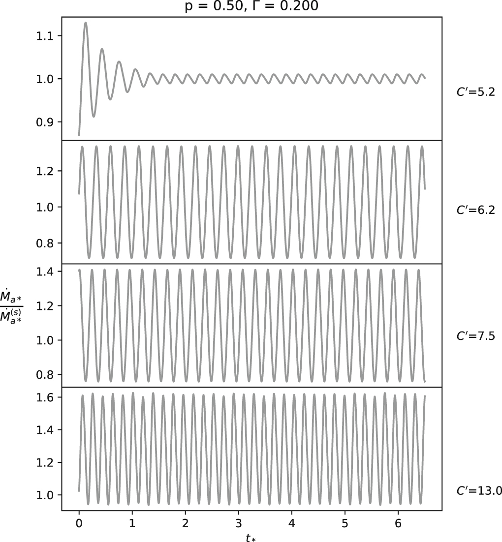 Standard image High-resolution imageIn the growing oscillation cases, the mass accretion rate grows until it saturates after some time. This saturation of oscillation is caused by the local surface density reaching negligible values or, in other words, complete depletion of matter from that region of the disk. We expect that if S86 continued their calculations to longer times, they would likely find the same behavior. For C = 14.4 shown above, our simulations showed that during this phase,