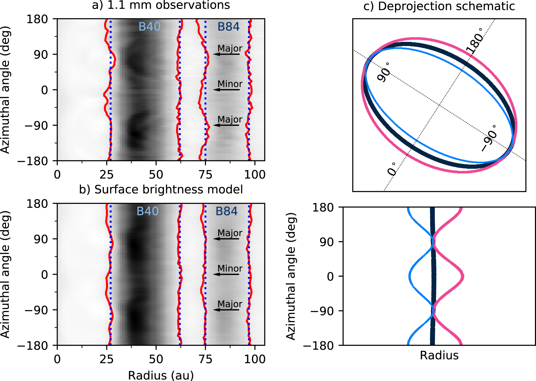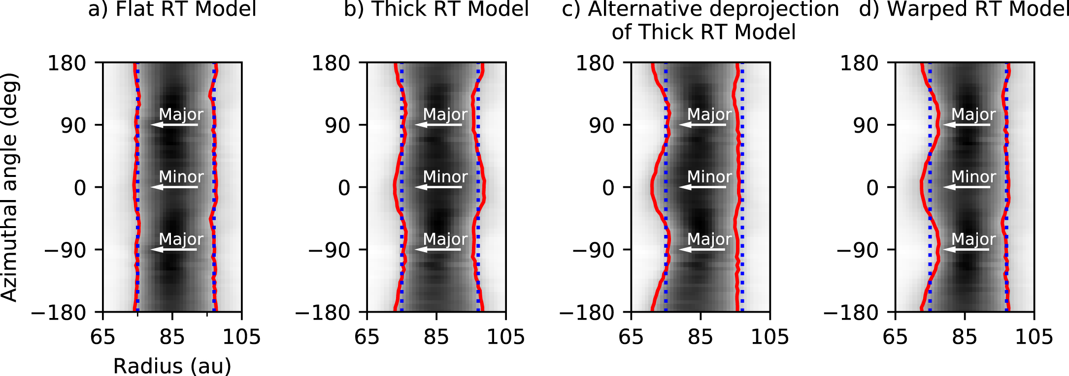 21 are used to deproject. The arrows show the azimuthal angles corresponding to the major and minor axes of GM Aur. Red contours are drawn at an intensity level of 0.15 mJy beam −1 (equal to 15σ in the 1.1 mm observations). Blue dotted vertical lines are drawn as a reference for constant radius. Panel (a): Plot of a radiative transfer model of a geometrically and optically thin ring. The ring contours are approximately vertical (i.e., at constant radius). Panel (b): Plot of a radiative transfer model of a geometrically and optically thick ring. The inner contour traces larger radii near azimuthal angles corresponding to the major axis of the disk image (±90°) than near angles corresponding to the minor axis (0°, ±180°). Meanwhile, the outer contour has the opposite behavior. Panel (c): Plot of the same model from panel (b), except an inclination angle of 52° is used to deproject rather than the true inclination of 53