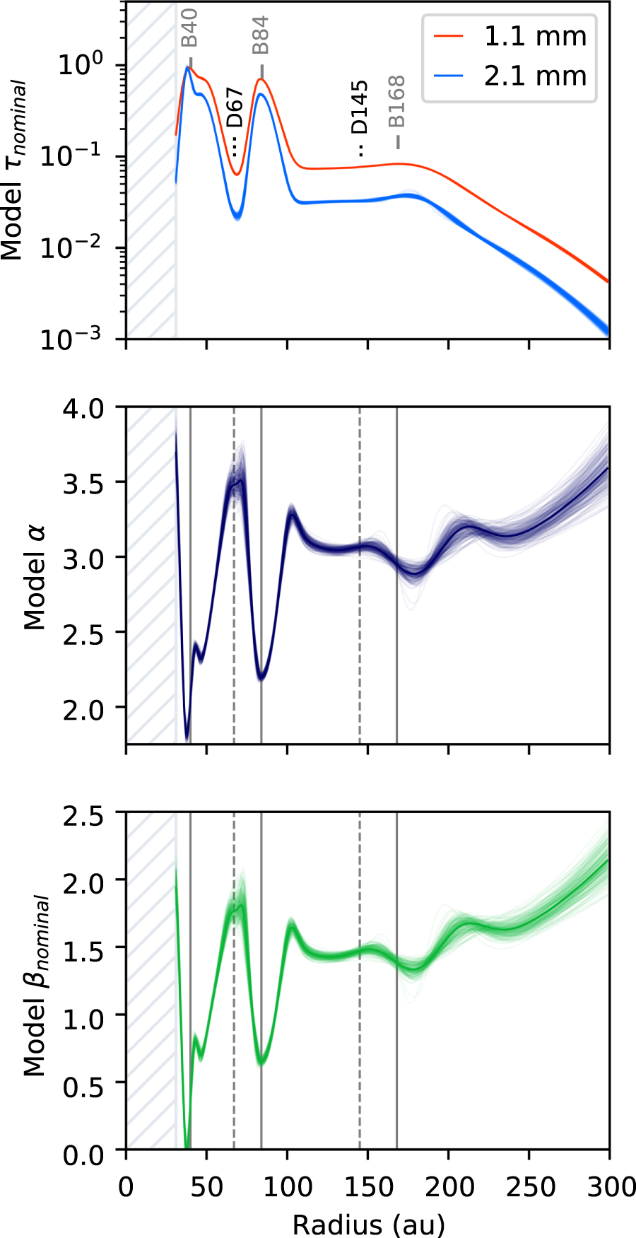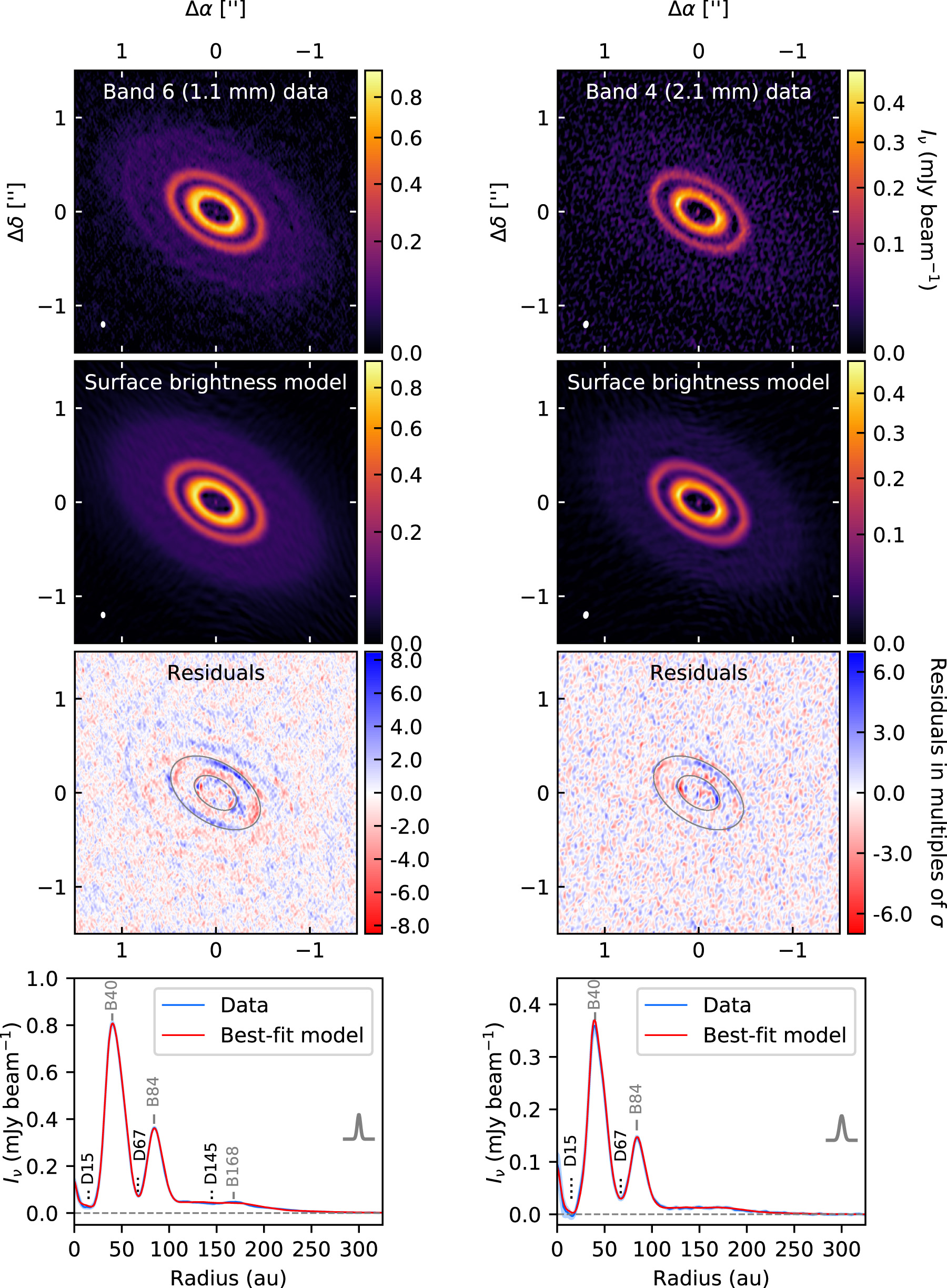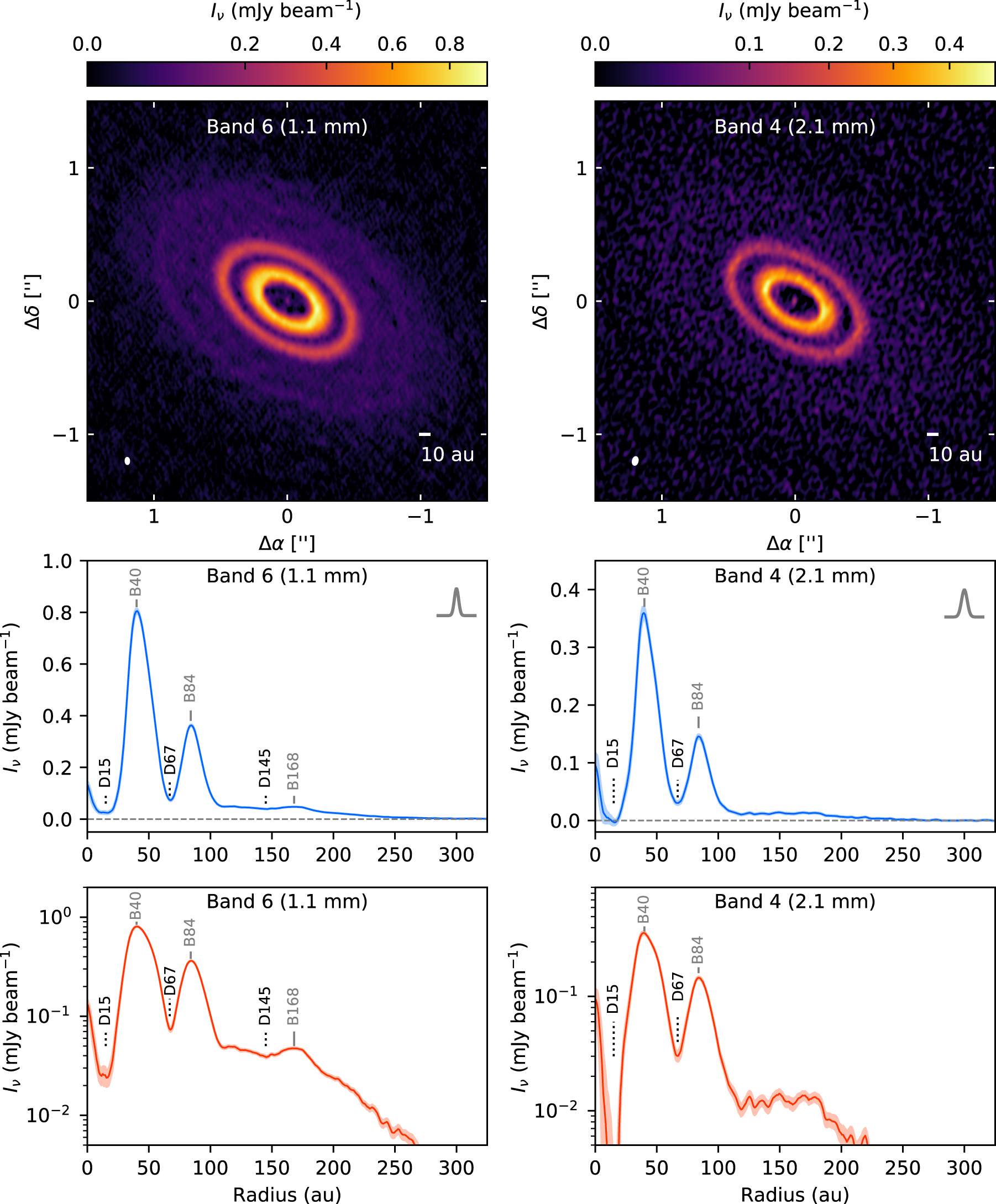21, then averaging the pixel intensities within annular bins one au wide. The continuum observations in both bands reveal faint, compact emission at the center of the disk, bright narrow rings at R ∼ 40 and ∼84 au, and faint, diffuse emission beyond R ∼ 100 au. At 1.1 mm, a faint ring is visible at R ∼ 168 au on top of the outer diffuse emission. While the 2.1 mm image does not show an unambiguous counterpart to this ring, perhaps due to the lower S/N of the data, there appears to be a slow rise in emission toward R ∼ 170 au and a steeper falloff outside this radius. In accordance with the nomenclature from Huang et al. (2018b), each ring is labeled with the prefix "B" (for "bright") followed by the radial location of the emission maximum rounded to the nearest whole number of astronomical units. The convention is similar for the gaps, except the prefix "D" (for "dark") is used. B40, D67, and B84, as well as the diffuse outer emission, were previously inferred from 930 μm observations at a resolution of ∼0