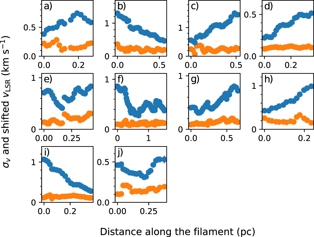 Standard image High-resolution imageSpecifically, filaments b, e, f, g, and j clearly show such a trend. Indeed, the Wald Test (see Fahrmeir et al. 2013) revealed that these filaments all have p-values <0.01 for a null hypothesis where the data are consistent with a zero-slope linear trend. The linear least-squares regression slopes of these trends are 0.40, 0.41, 0.17, 0.21, and 0.16, respectively, in units of km s−1 pc−2. Moreover, the Pearson correlation coefficients, i.e., r-values (see Cohen 1988), of these regressions all fall in the range of 0.2–0.4, suggesting that these positive correlations are indeed significant but relatively scattered.