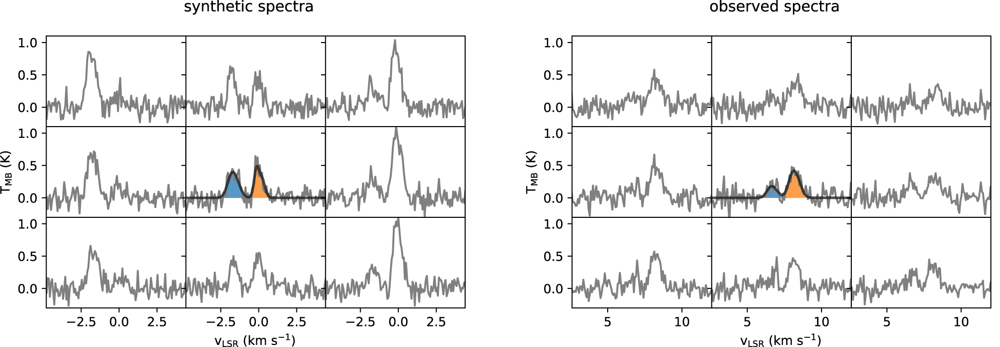 Figure 1. NH3 (1, 1) spectra (gray) taken from a synthetic spectral cube (left) and the NGC 1333 observation (right) over a grid of 3 × 3 footprint, zoomed in to focus on the main hyperfine structures. Models fitted to all 18 hyperfine components of the spectra in the center pixel are shown in black, and the individual components of the model are shown in blue and orange.