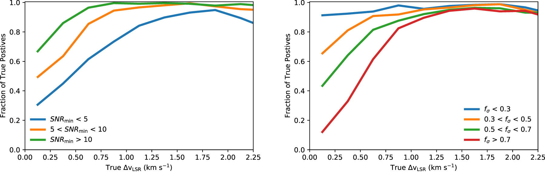 Figure 3. The rate of true-positive identification of a two-slab spectrum plotted as a function of the vLSR separation between the slabs. The left panel shows these test samples binned by the S/N values of the fainter slab while the right panel shows these values binned by velocity dispersion ratio fσ of the narrow slab with respect to the wide slab. The median σv values for the narrow and wide components in these samples are 0.23 km s−1 and 0.48 km s−1, respectively.