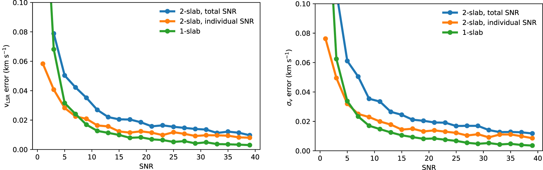 To quantify how well MUFASA captures the true vLSR and σv, Figure 4 shows the true 1σ errors of these two parameter fits as a function of the following values: the S/N of a two-slab spectrum, the S/N of an individual slab in a two-slab spectrum, and the S/N of a one-slab spectrum. These S/N-error relations are plotted with errors calculated from the median absolute deviation (MAD) of the fitted parameters with respect to the true value behind a synthetic spectrum. As expected, the parameter errors are anticorrelated with the S/N. We note that these errors also account for any potential cases where the spatial order of velocity slabs may not be ordered correctly along a line of sight.