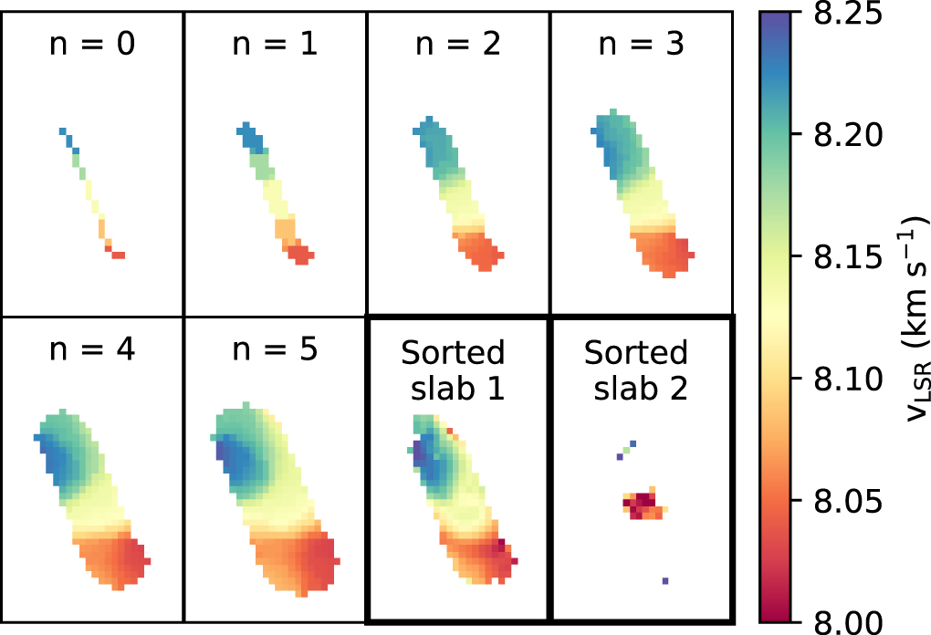 To illustrates such a process, Figure 8 shows a ppv-footprint at each iteration in panels labeled with the iteration number n. The last two panels of Figure 8 show vLSR maps of the first and second velocity slabs in an association, taken from the final iteration. The first slab shown here defines the final vc-structure used in our filament analyses.