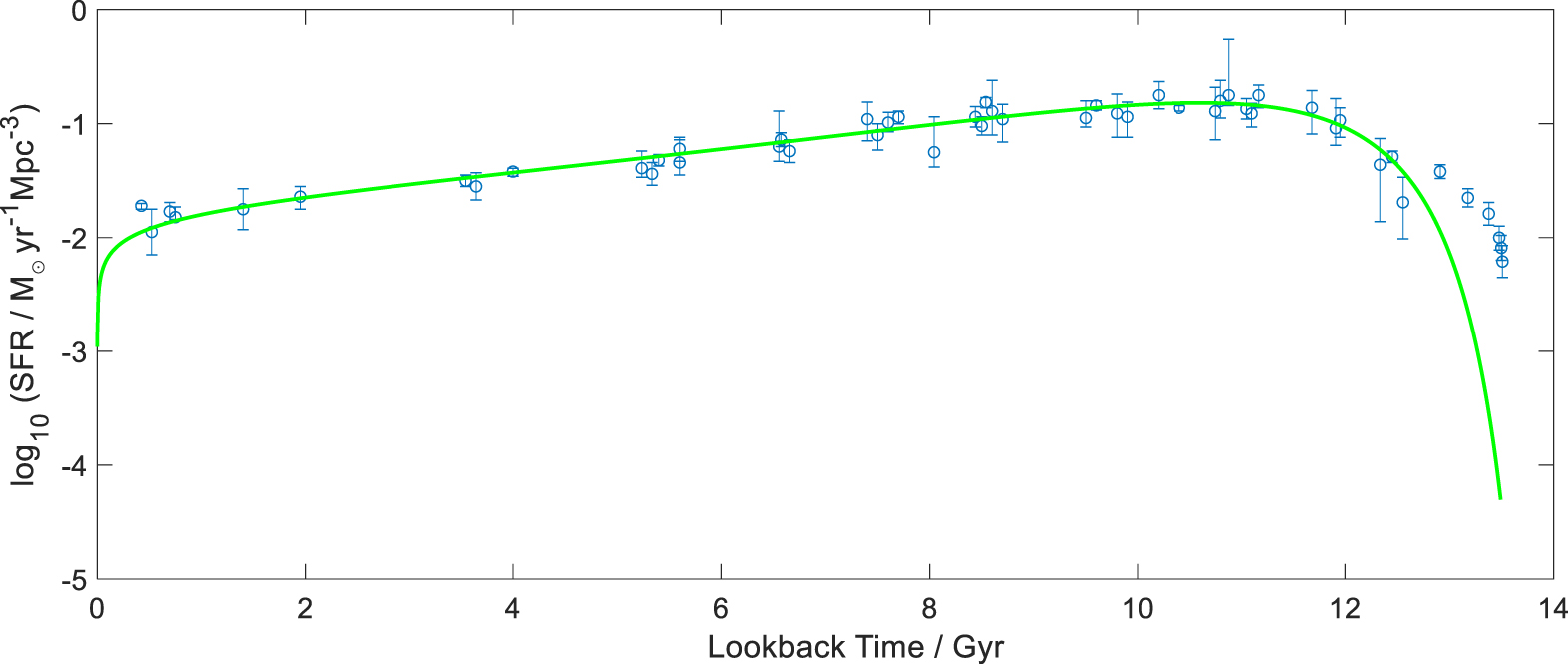 Figure 1. Cosmic star formation history data (from Madau & Dickinson 2014) with an analytical fit using Equation (4).