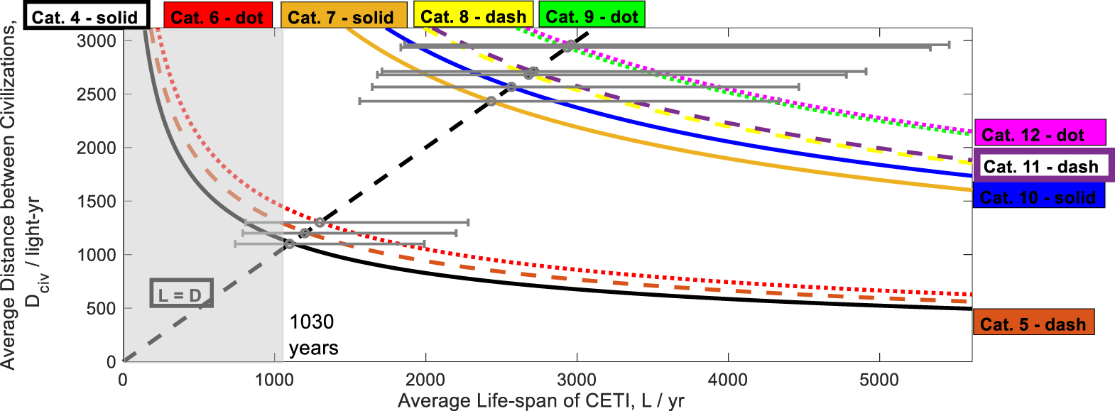 Figure 5. Average distance between CETI, (Dciv/lt-yr), vs. average lifetime of CETI, (L/yr), for modeling categories 4–12 (see Table 1). The diagonal line (L = D) is used to determine minimum expected SETI search time with associated error bars (see Table 12). The shaded region is where average life span of CETI, L < 1030 yr; here, species extinction is likely to occur before detection of closest CETI.