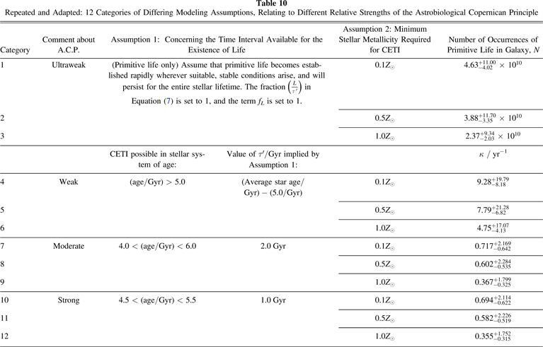 Table 1. Twelve Categories of Differing Modeling Assumptions, Relating to Different Relative Strengths of the Astrobiological Copernican Principle