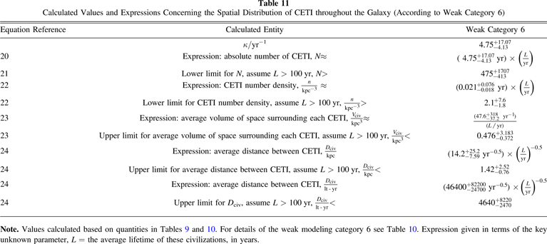 Table 11. Calculated Values and Expressions Concerning the Spatial Distribution of CETI throughout the Galaxy (According to Weak Category 6)