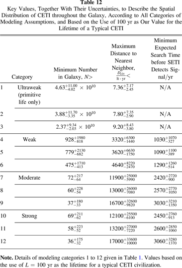Table 12. Key Values, Together With Their Uncertainties, to Describe the Spatial Distribution of CETI throughout the Galaxy, According to All Categories of Modeling Assumptions, and Based on the Use of 100 yr as Our Value for the Lifetime of a Typical CETI